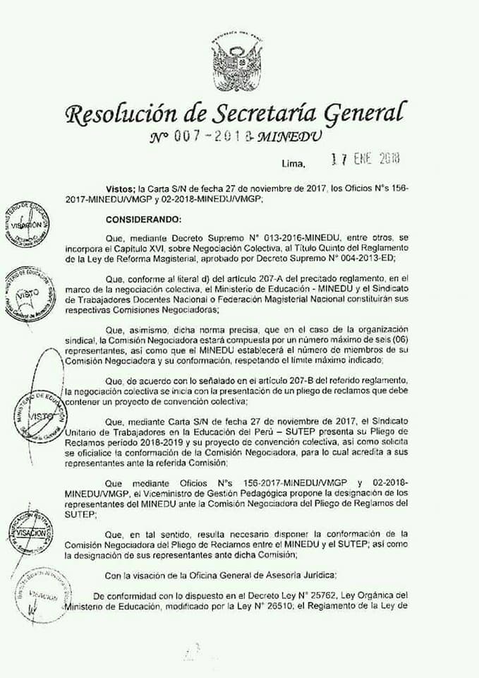 SUTEP PROV. TRUJILLO: YA SALIÓ LA RESOLUCIÓN DE SECRETARIA GENERAL RECONOCIENDO LA COMISIÓN DE TRATO DIRECTO ENTRE EL ÚNICO REPRESENTANTE DE LOS MAESTRO (SUTEP) Y EL MINEDU
